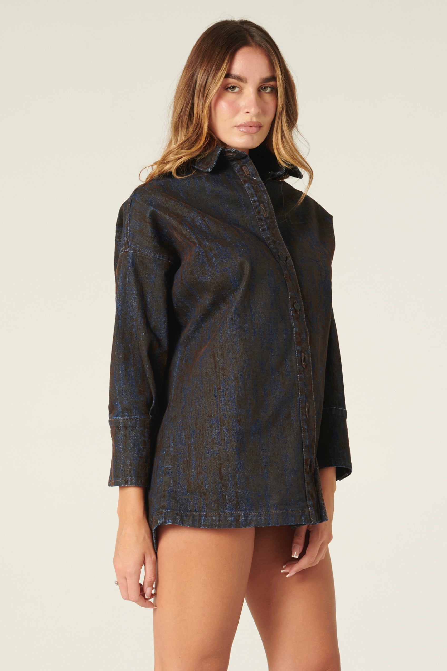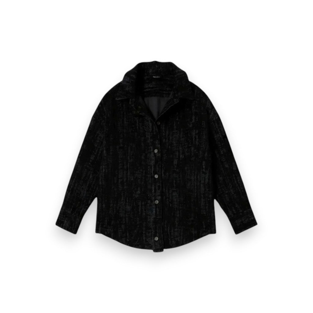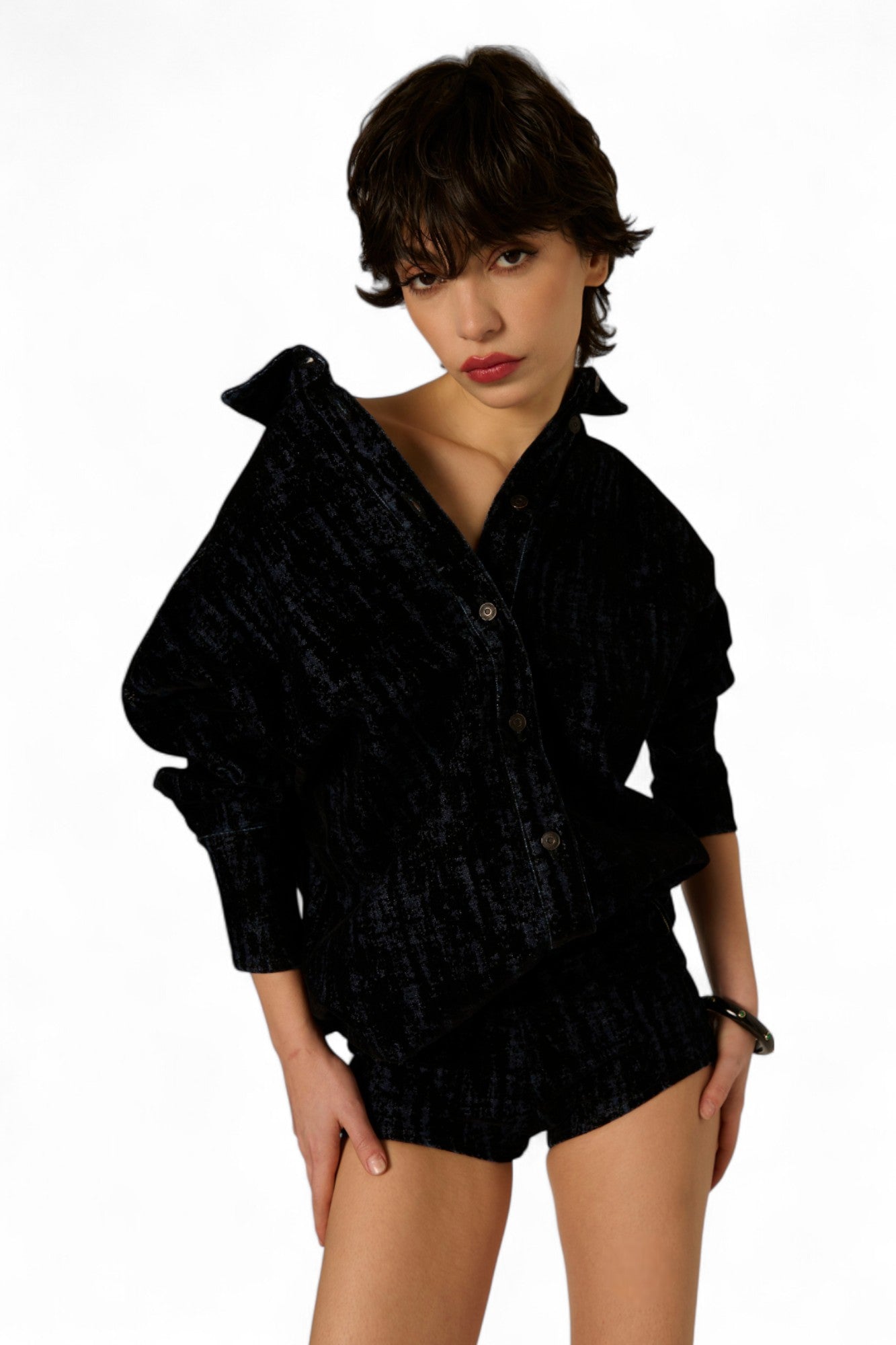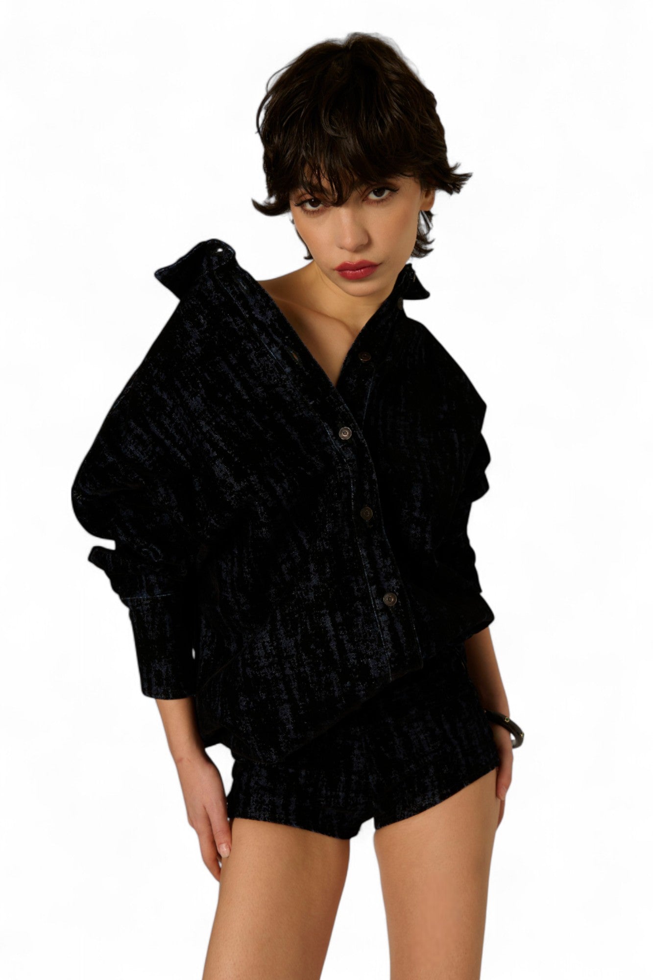 La giacca camicia Lola oversize in denim floccato unisce praticità, versatilità e stile. Disponibile in nero o moro, il suo fit over assicura comfort, mentre il taglio cut out laterale aggiunge un tocco di tendenza. La finitura floccata rende il tessuto morbido e avvolgente. Perfetta da abbinare ai microshorts Fanny per un effetto jumpsuit unico o ai pantaloni Denise per un look più semplice ma raffinato. Non perdere l’occasione di rinnovare il tuo guardaroba con un capo che fa la differenza.