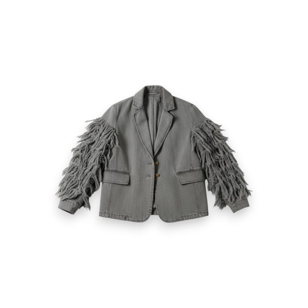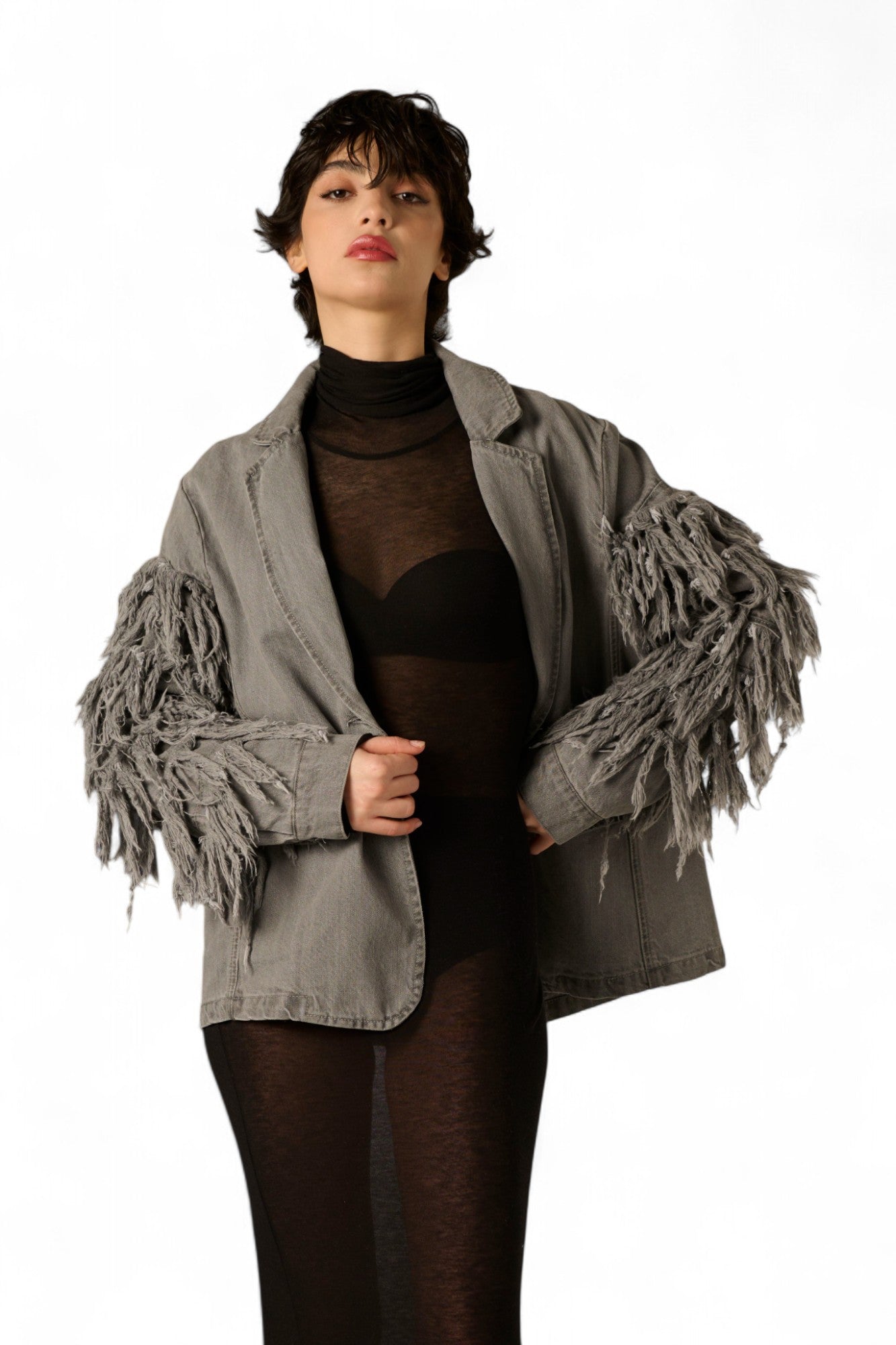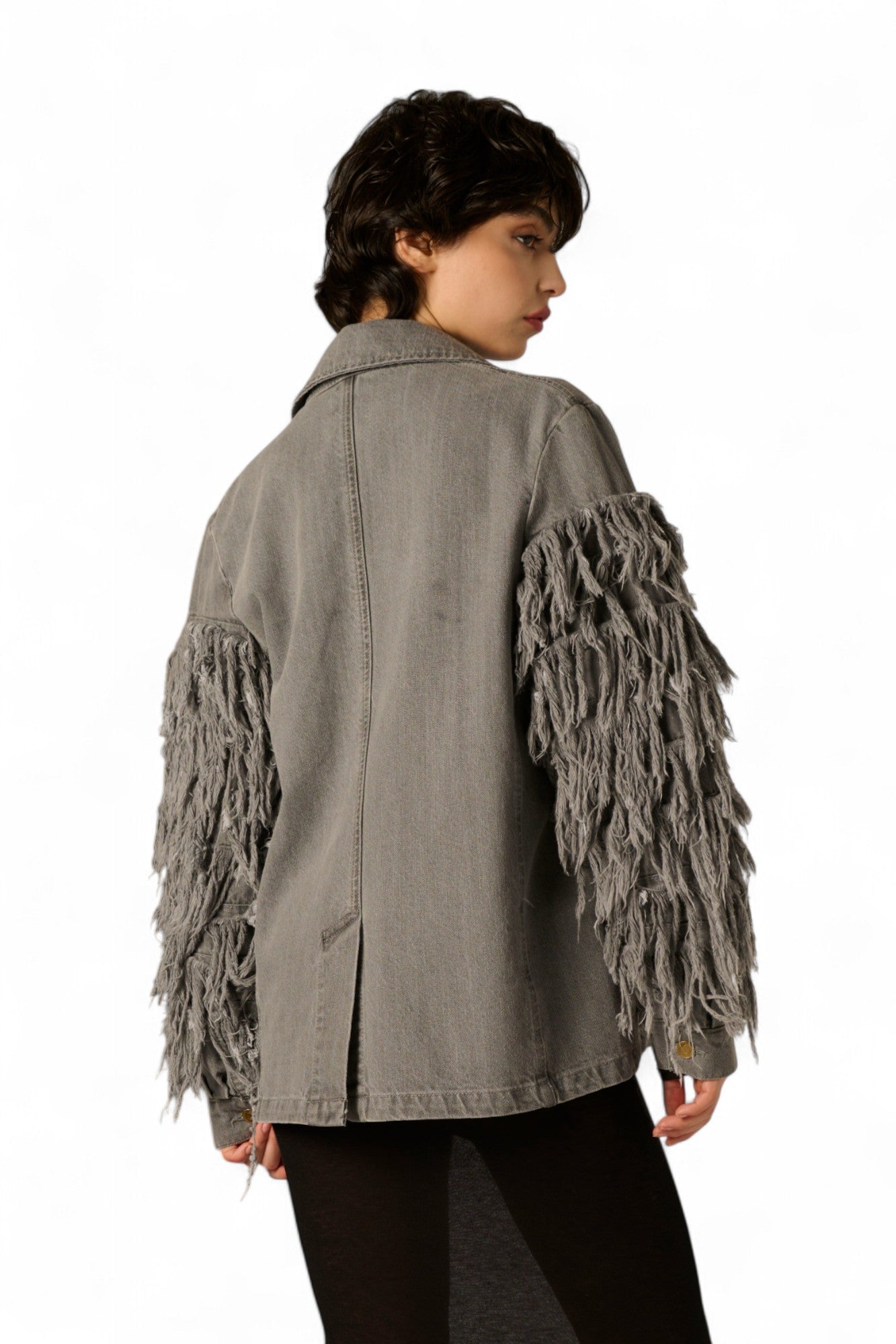 Dopo il grande successo dello scorso inverno del nostro bomber in denim grey fur, ecco una nuova proposta che si ispira al nostro best seller della scorsa stagione. La giacca Jessa in denim grigio con maniche in denim fur è il capo oversize che aggiunge carattere a ogni look. Con doppio bottone smaltato e monopetto, unisce stile deciso e tendenza in un unico pezzo versatile. Perfetta per serate in cui vuoi distinguerti con un mood particolare, questa giacca in pelliccia denim è destinata a diventare il tuo nuovo must-have. Lasciati conquistare dal suo fascino unico e dalla vestibilità comoda e moderna.