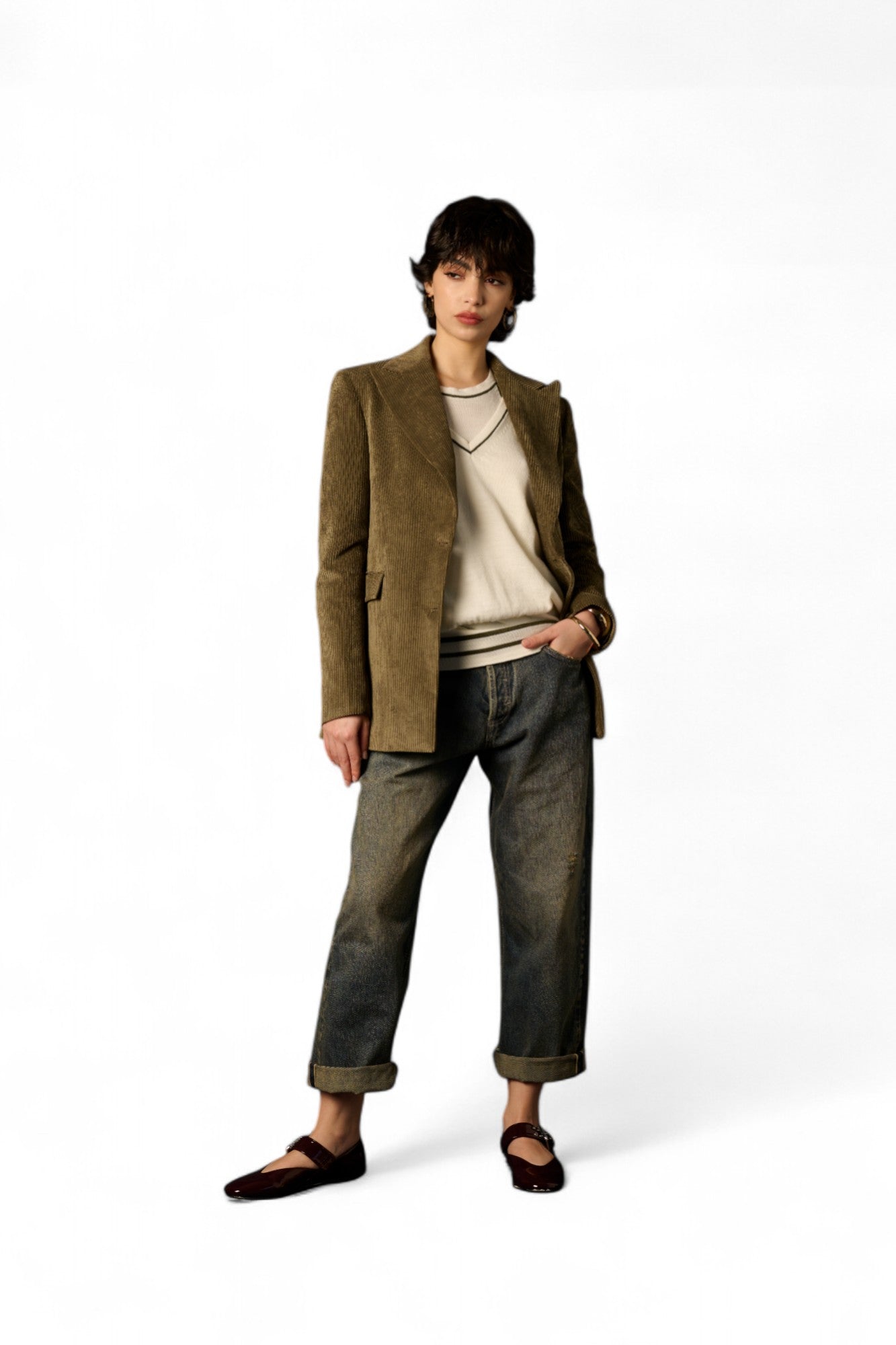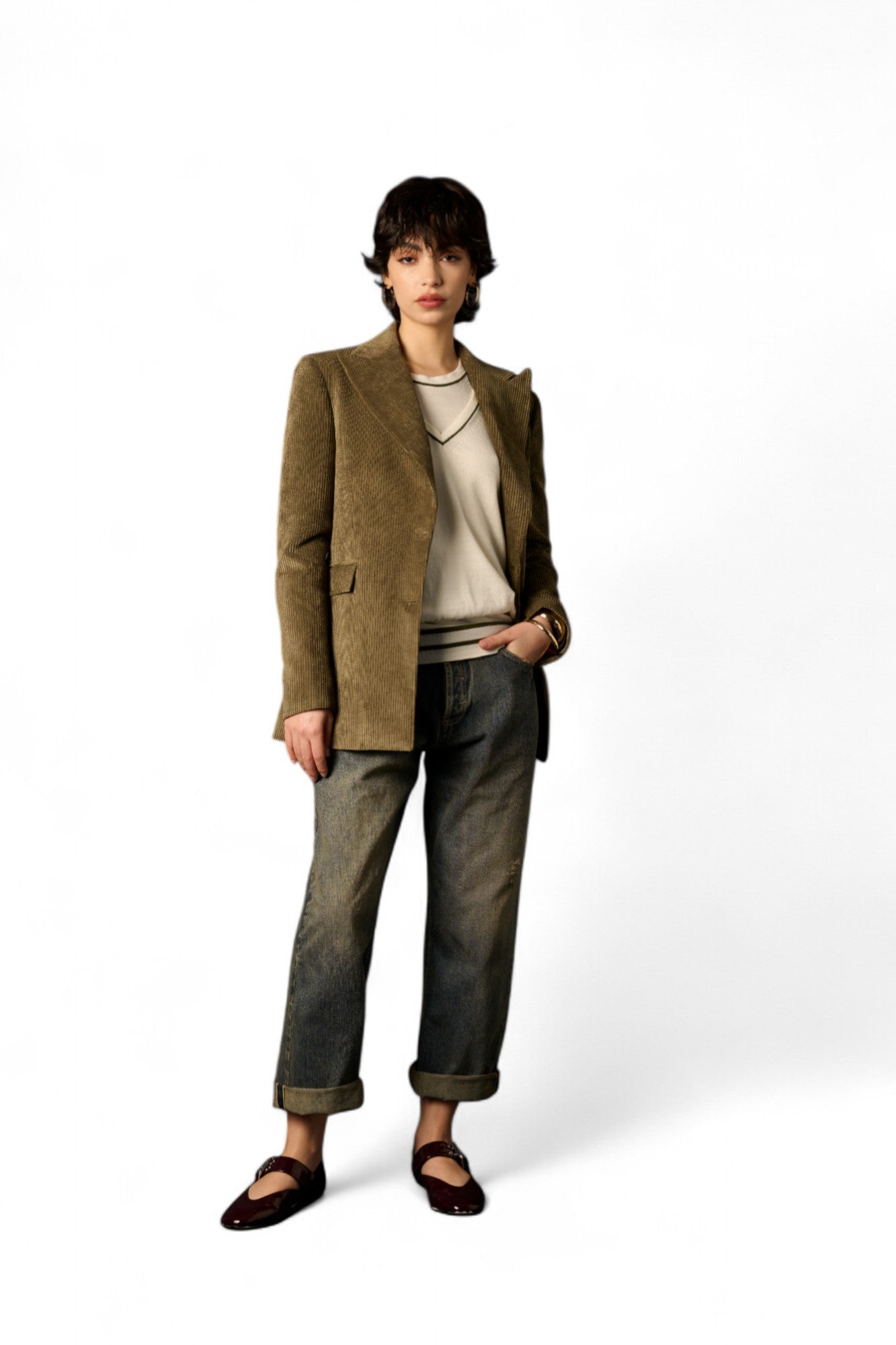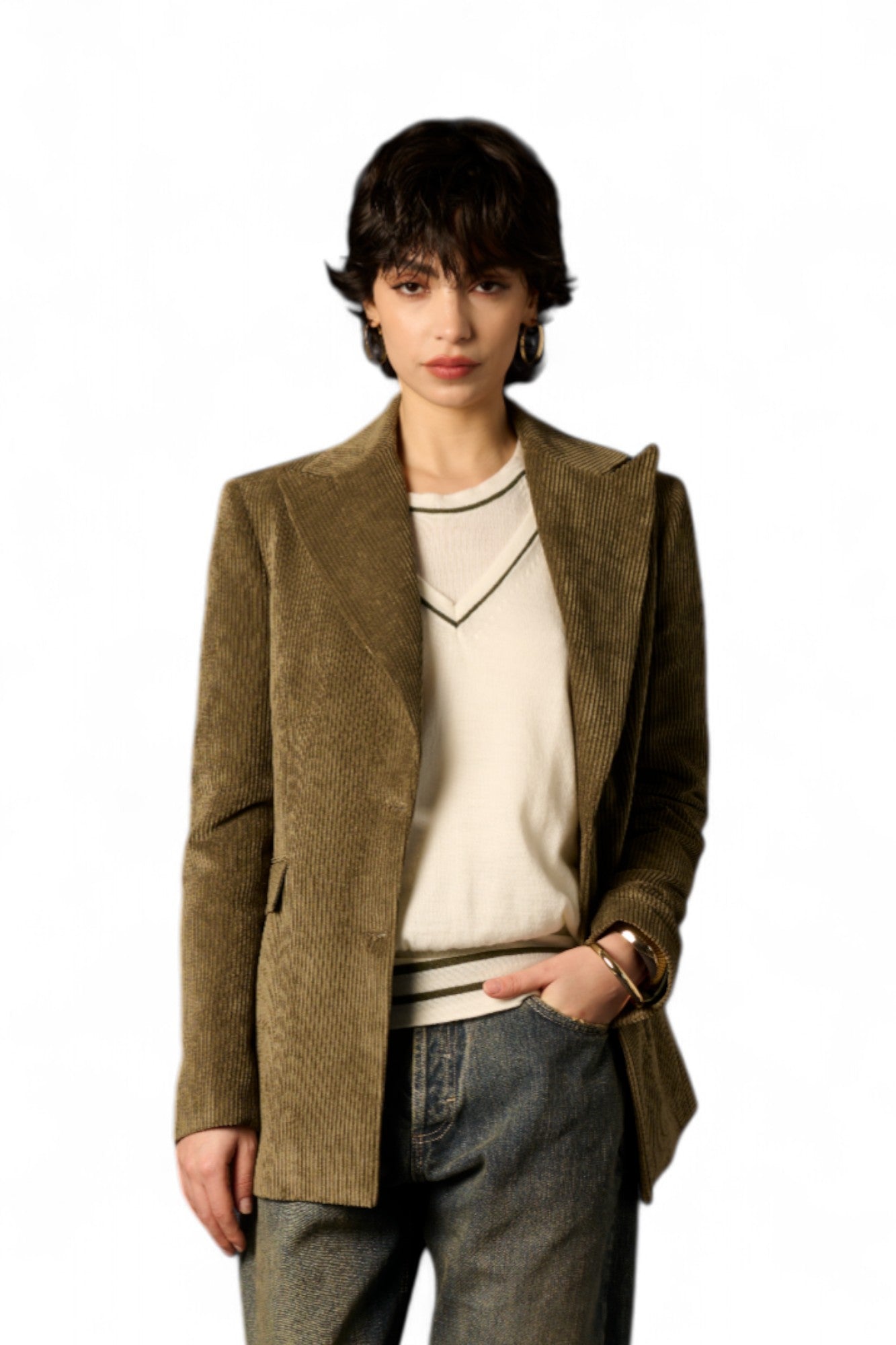 La giacca Susan, nel suo elegante color militare, segue perfettamente la tendenza dei toni terra di stagione. Ideale dalla mattina alla sera, si adatta con facilità a ogni momento della tua giornata: comoda e morbida grazie al velluto, ma con una struttura decisa che le conferisce carattere. Perfetta per il lavoro, basterà abbinarla con gli accessori giusti per trasformarla nel protagonista di una cena speciale. Scegli Susan per un look sofisticato e versatile.