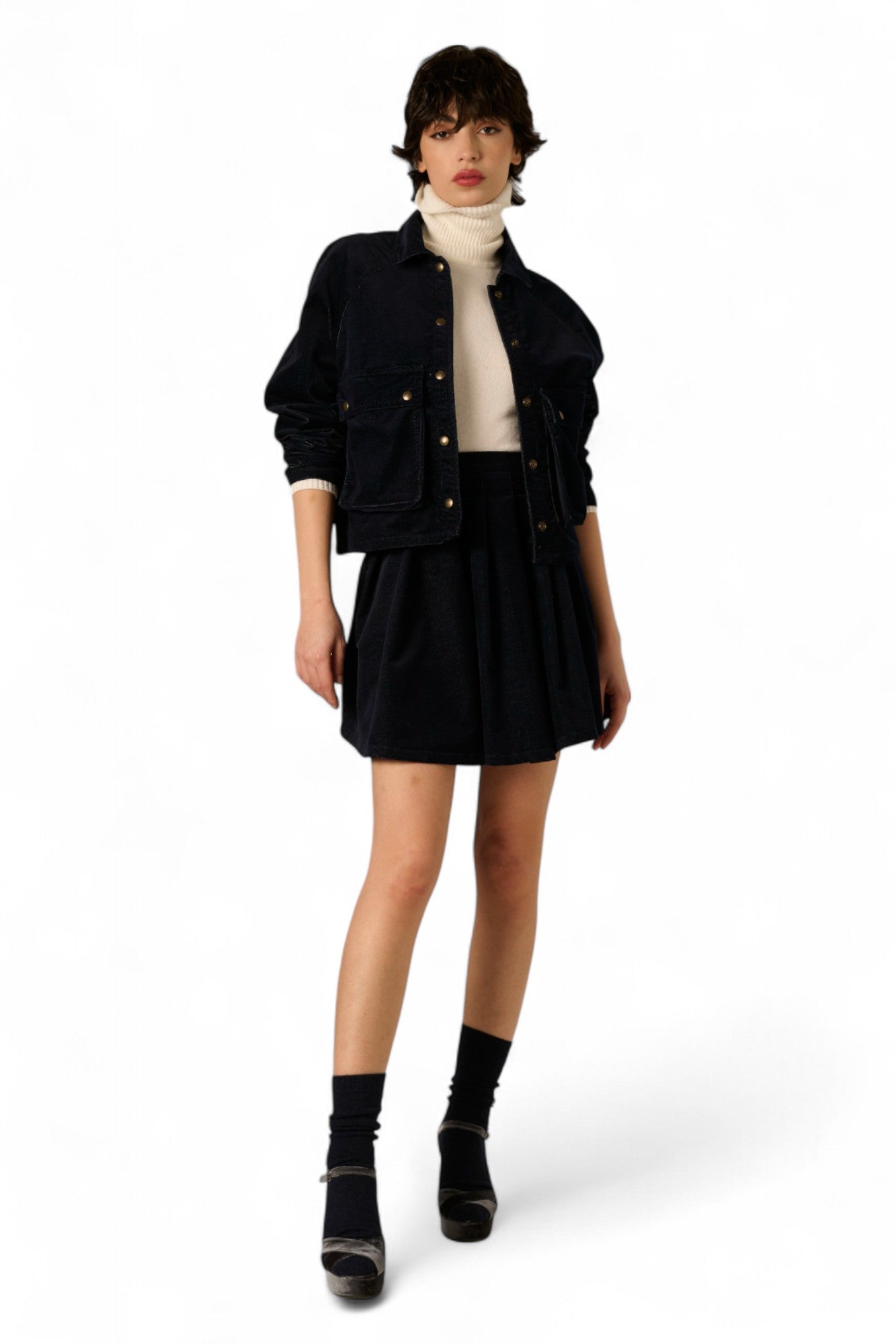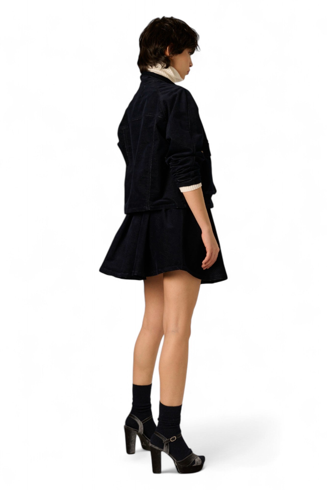 La gonna Fara a pieghe in denim floccato unisce stile e comfort con un tocco unico firmato GDD. Realizzata in denim morbido con una floccatura diagonale, è piacevole al tatto e avvolgente da indossare. Perfetta per creare un look sofisticato e di tendenza, si abbina al giubbino bomber Jolie per un outfit completo, comodo e alla moda. Scegli la gonna Fara per un tocco di originalità e femminilità nel tuo guardaroba.