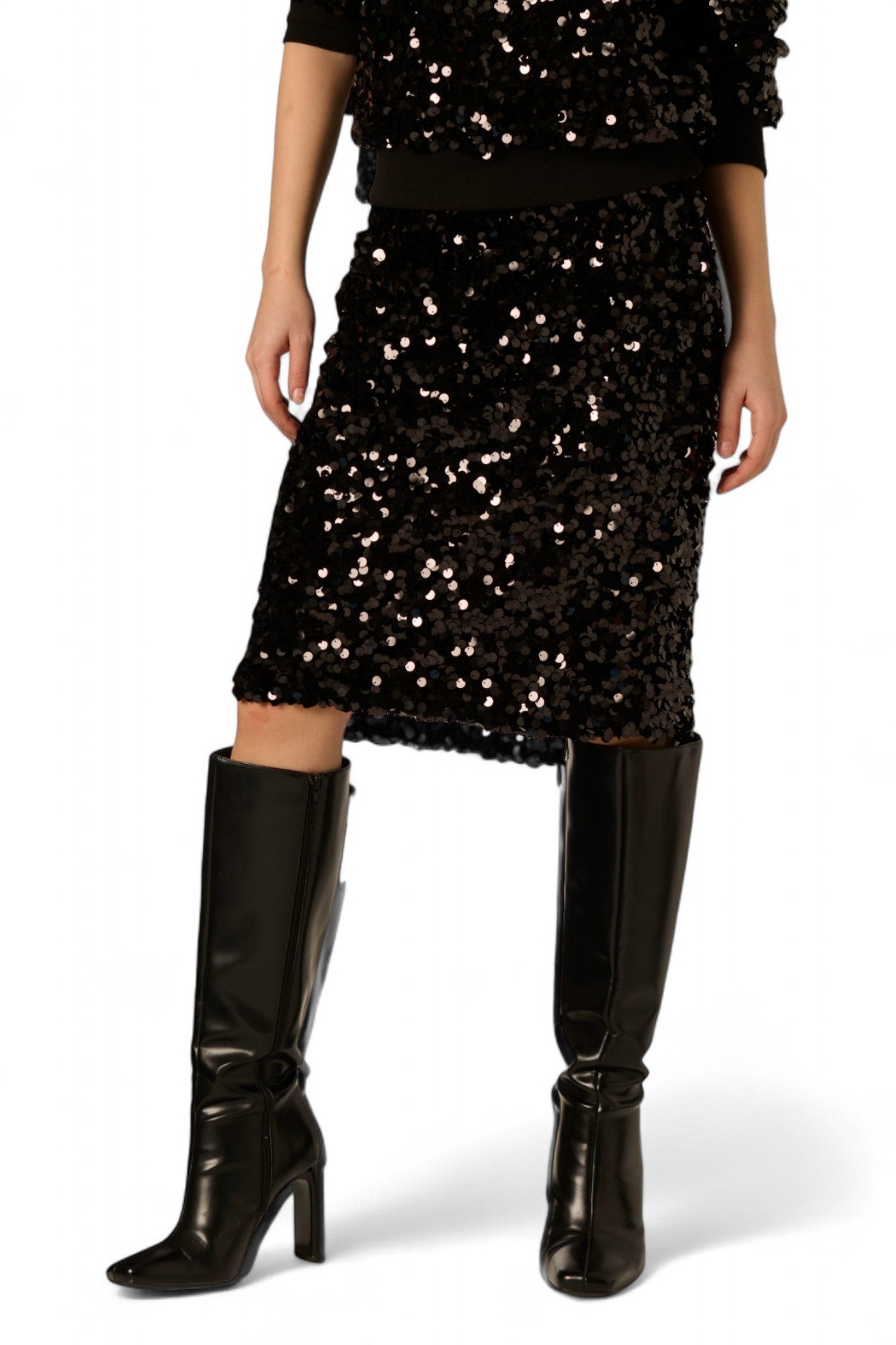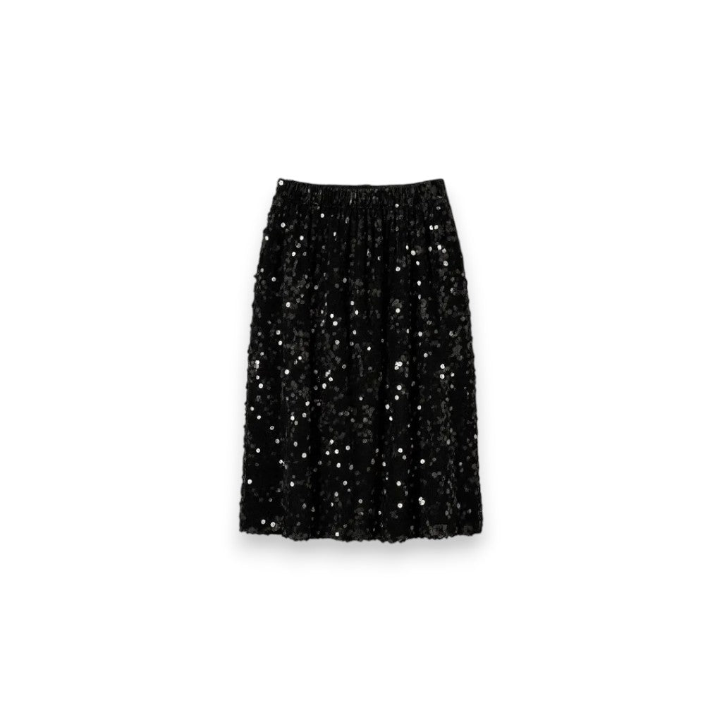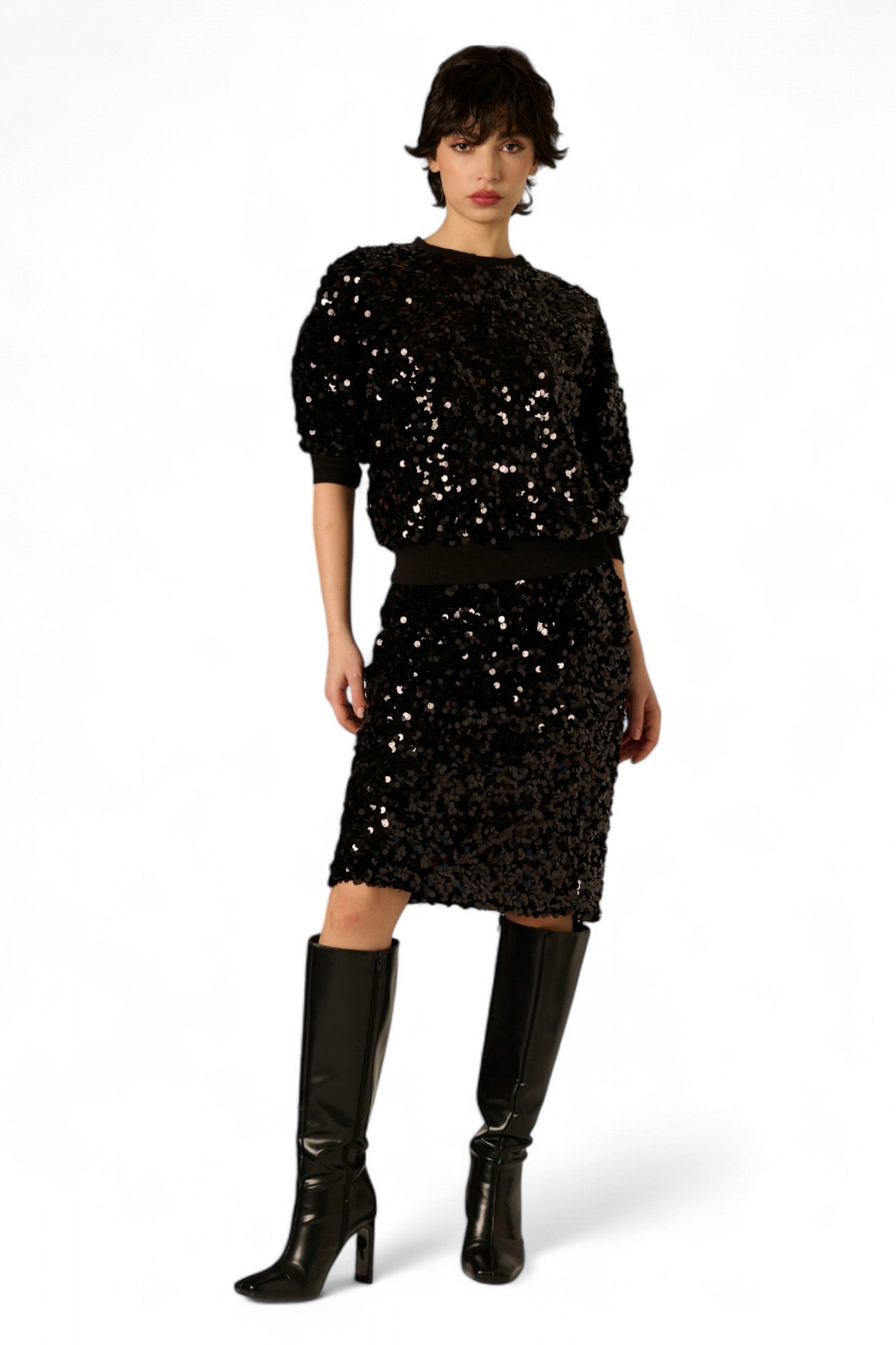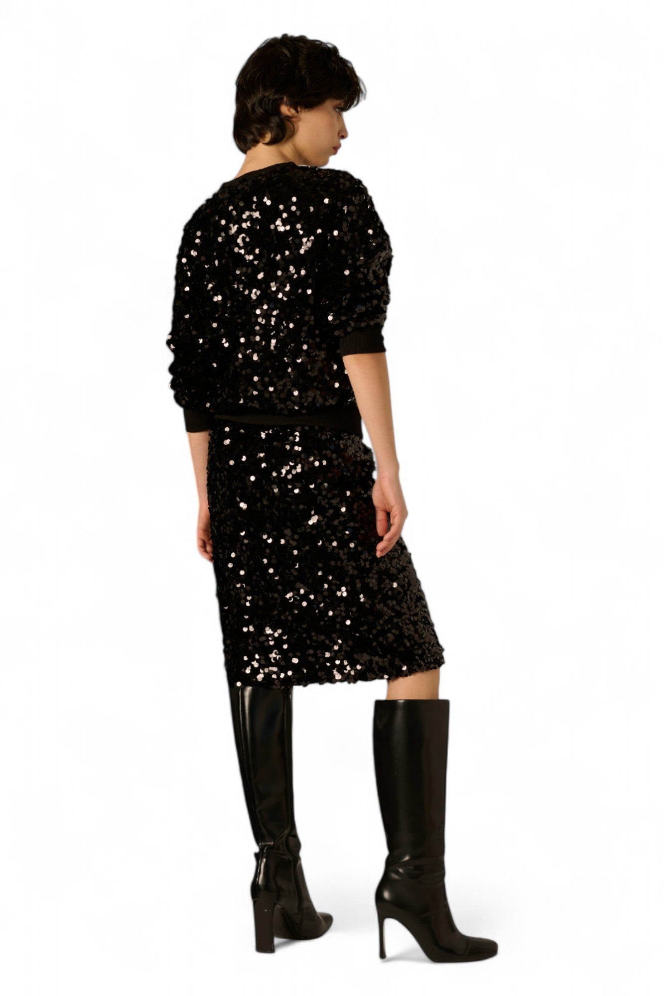 La gonna Willa longuette con pailettes nere grandi all over unisce praticità ed eleganza in un unico capo. Realizzata su una morbida e luminosa ciniglia, completamente ricoperta da pailettes cucite all over e completamente foderata al suo interno. Perfetta da abbinare alla felpa Vany per un look unico, presentandosi come un abito scintillante, si presta anche a uno stile più casual con una camicia in denim e scarpe basse. Un pezzo versatile e trendy che valorizza ogni outfit con un tocco di brillantezza e raffinatezza.