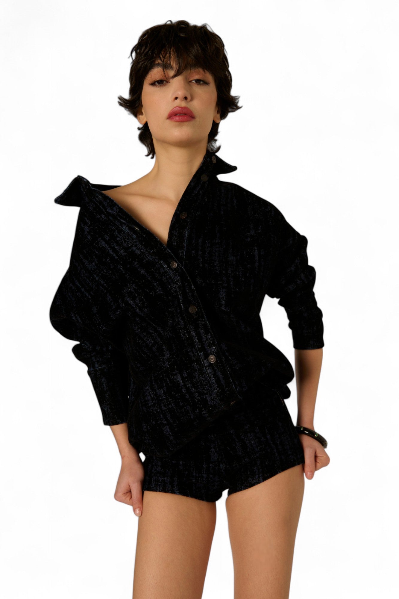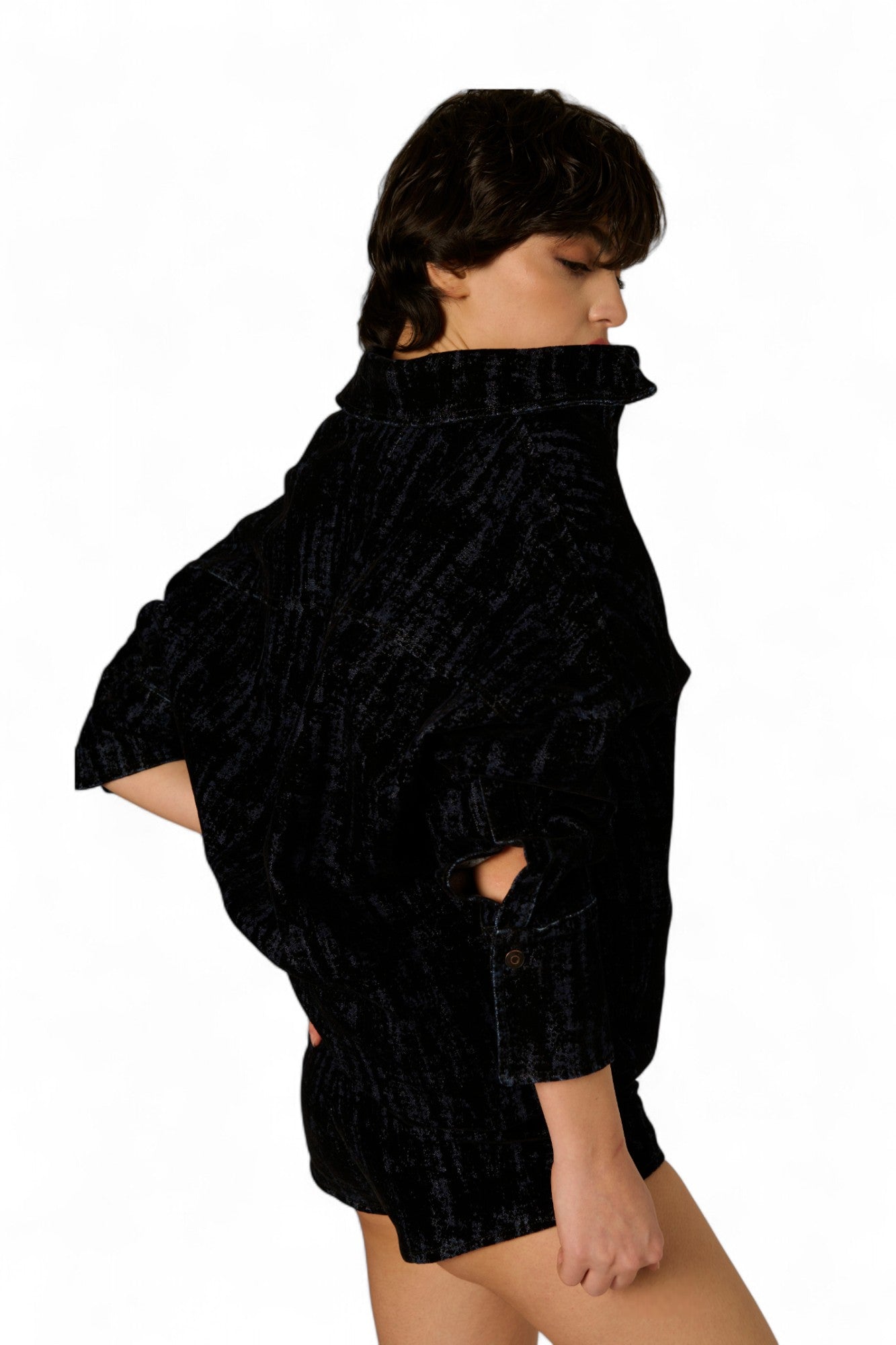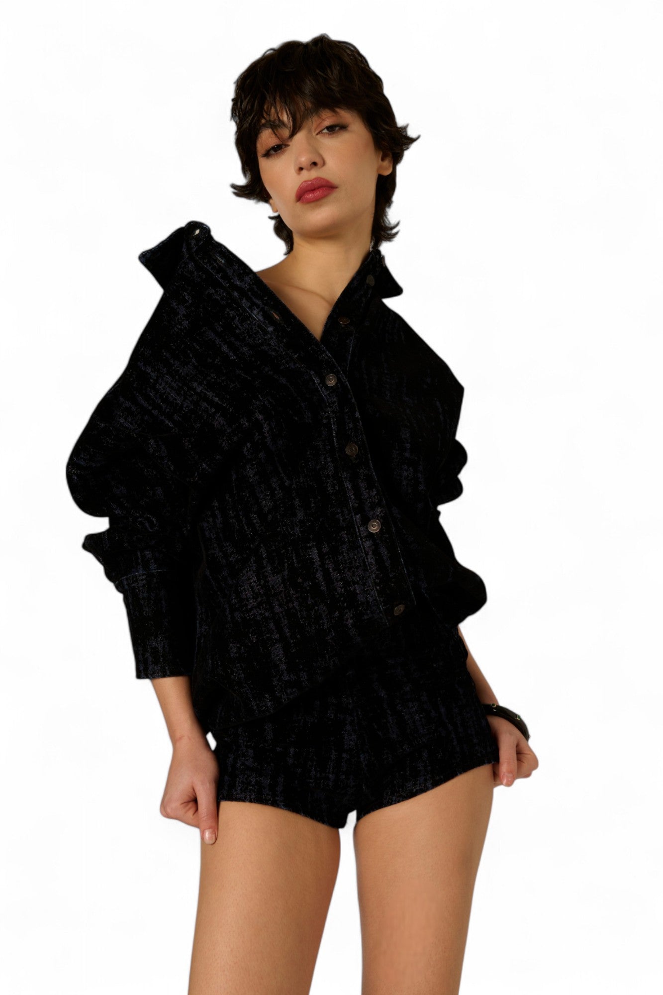 I microshorts Fanny in denim floccato sono la scelta perfetta per chi vuole distinguersi con stile nelle serate della nuova stagione. Il fit slim e accorpato, con una lunghezza leggermente più lunga sul retro, garantisce comfort e un look sofisticato. Disponibili in flok nero o moro, si abbinano perfettamente alla giacca camicia Lola o alla giacca basic Lily, entrambe con la stessa finitura morbida e avvolgente in denim floccato. Preparati a vivere serate indimenticabili con un outfit unico e super trendy.