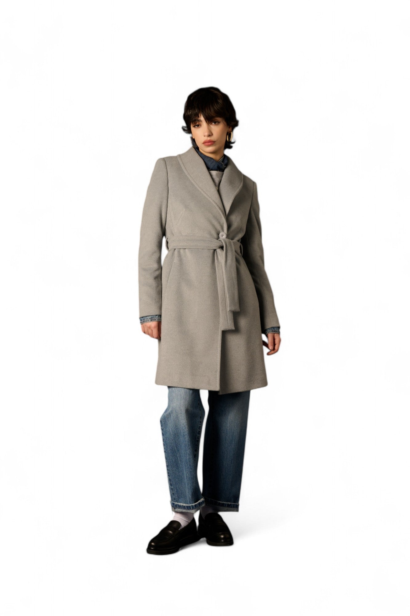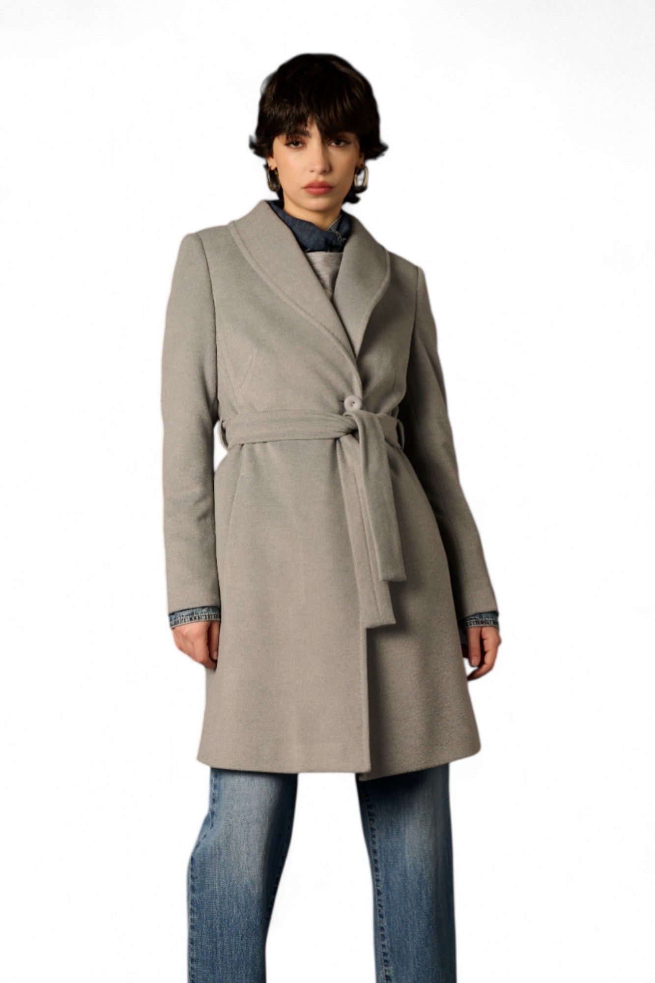 Il cappotto Sonya unisce praticità, semplicità e calore in un modello perfetto per ogni occasione. La lunghezza a metà coscia valorizza la silhouette, mentre la fusciacca in vita crea una linea elegante e slanciata. Il collo sciallato aggiunge un tocco di delicatezza e versatilità, rendendo questo capo ideale sia per look casual che più raffinati.