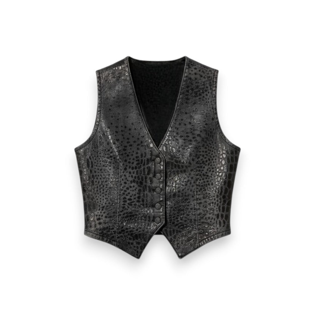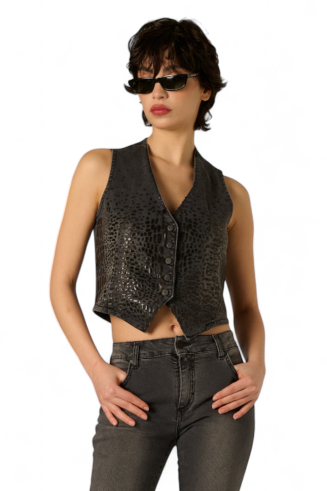 Il gilet Jen in denim nero combina un fit slim regular semplice e basico con un design distintivo grazie all’applicazione stampa crocodile su tutta la parte frontale. L’abbottonatura a cinque bottoni aggiunge un tocco classico, mentre l’effetto cool e chic lo rende perfetto per un look d’impatto. Abbinalo ai jeans Cindy per un total look che non passerà inosservato.