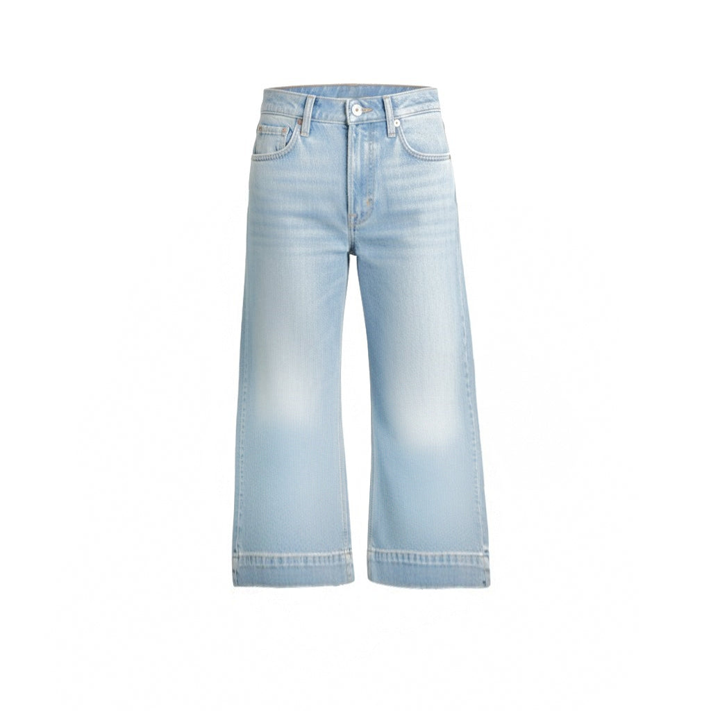 La modella è alta 1.79m e indossa la taglia 28. Il fit wide leg è comodo con gamba ampia ma equilibrata, vita regolare. La lunghezza cropped che cade sopra la caviglia.