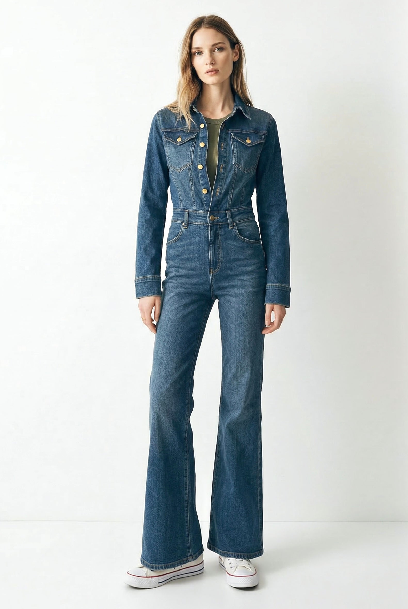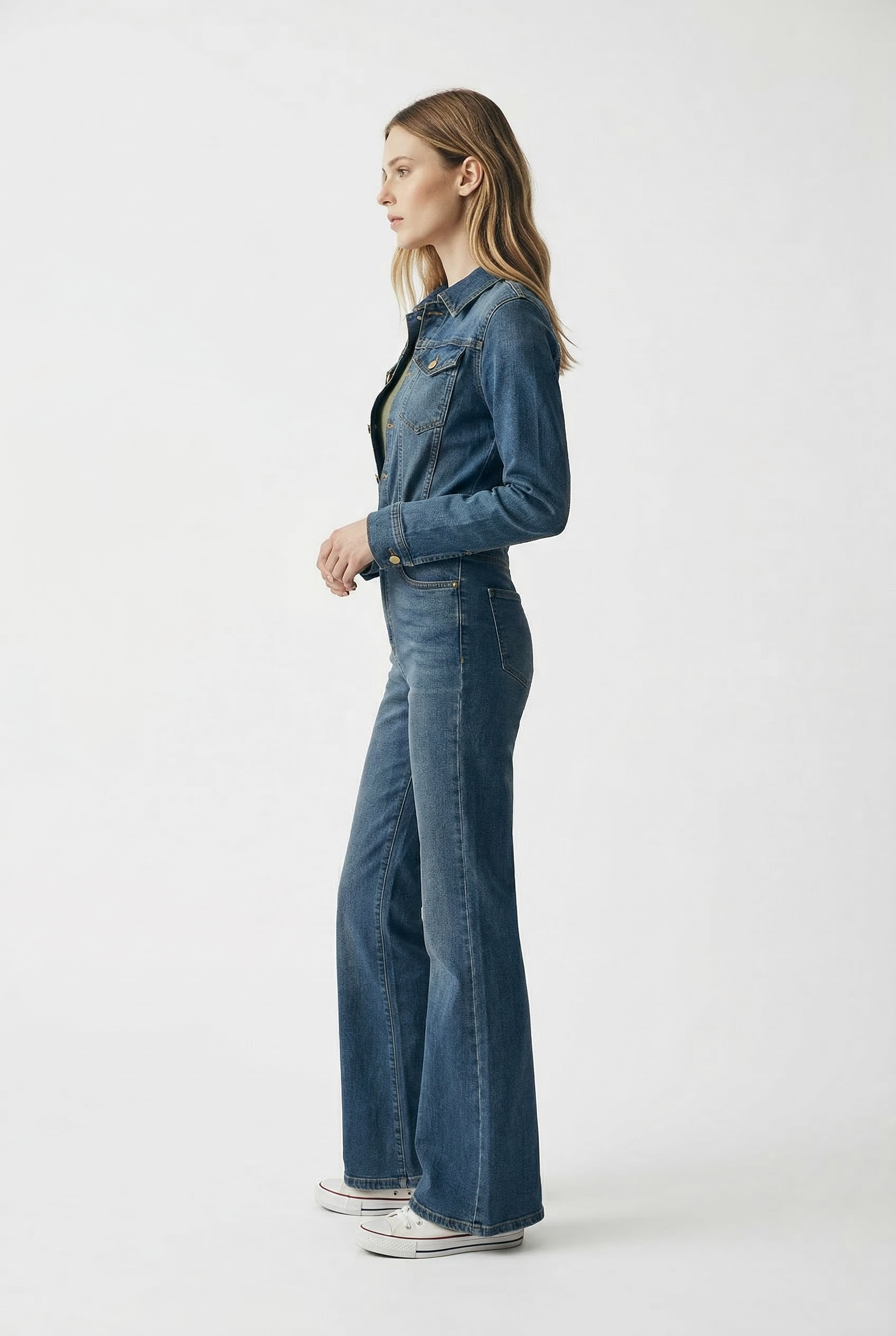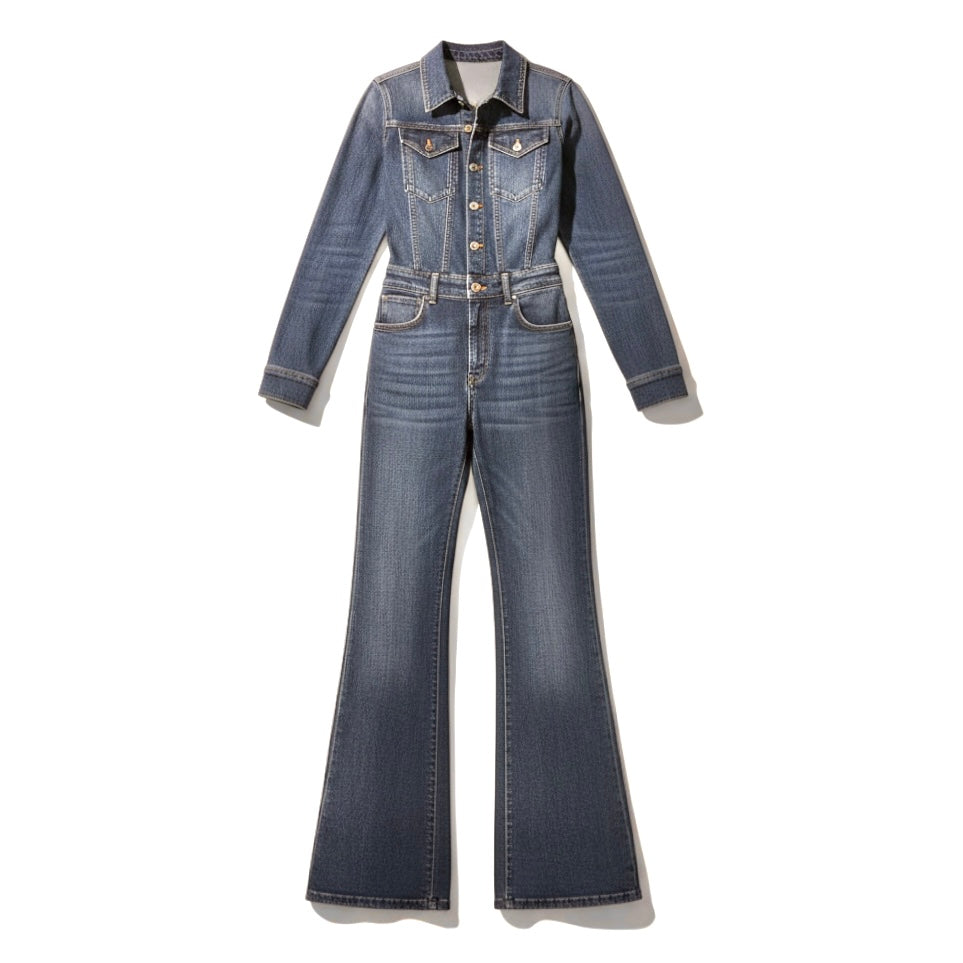 Scopri la Jumpsuit Margot in denim stretch a zampa nella sua nuova versione primaverile SS26, il capo essenziale per un look elegante e femminile senza compromessi.