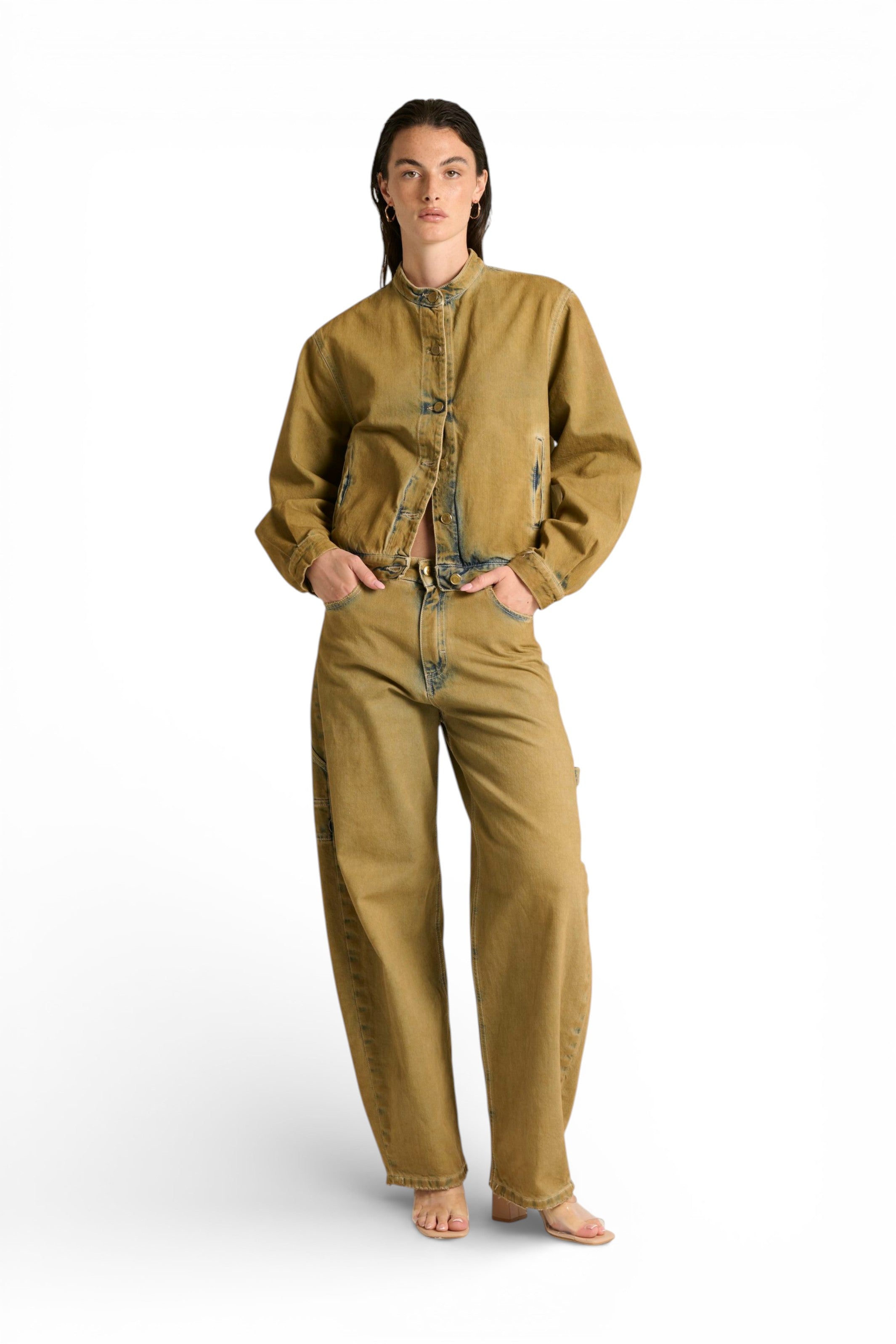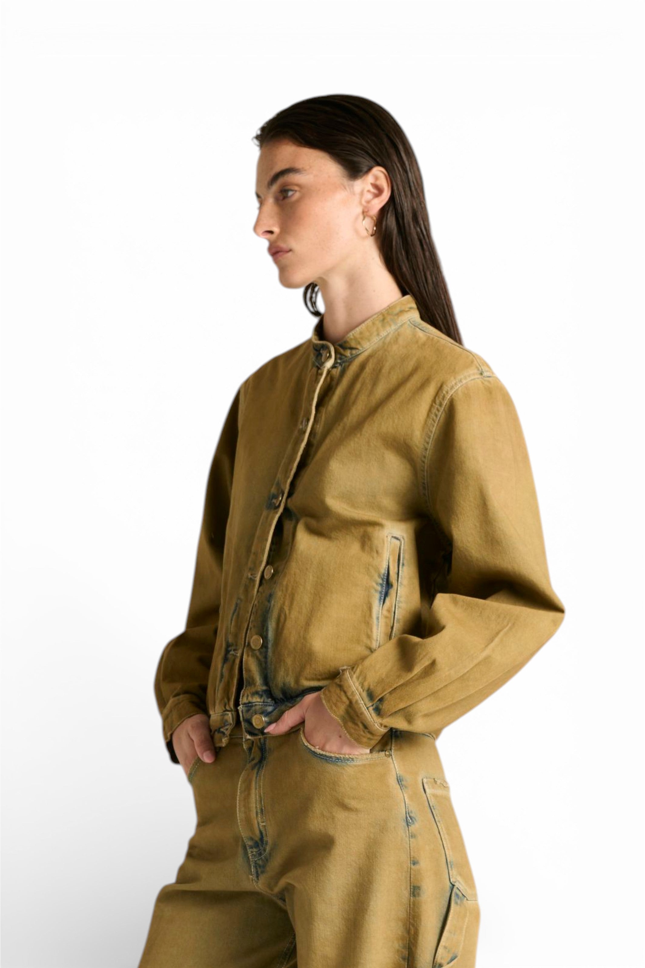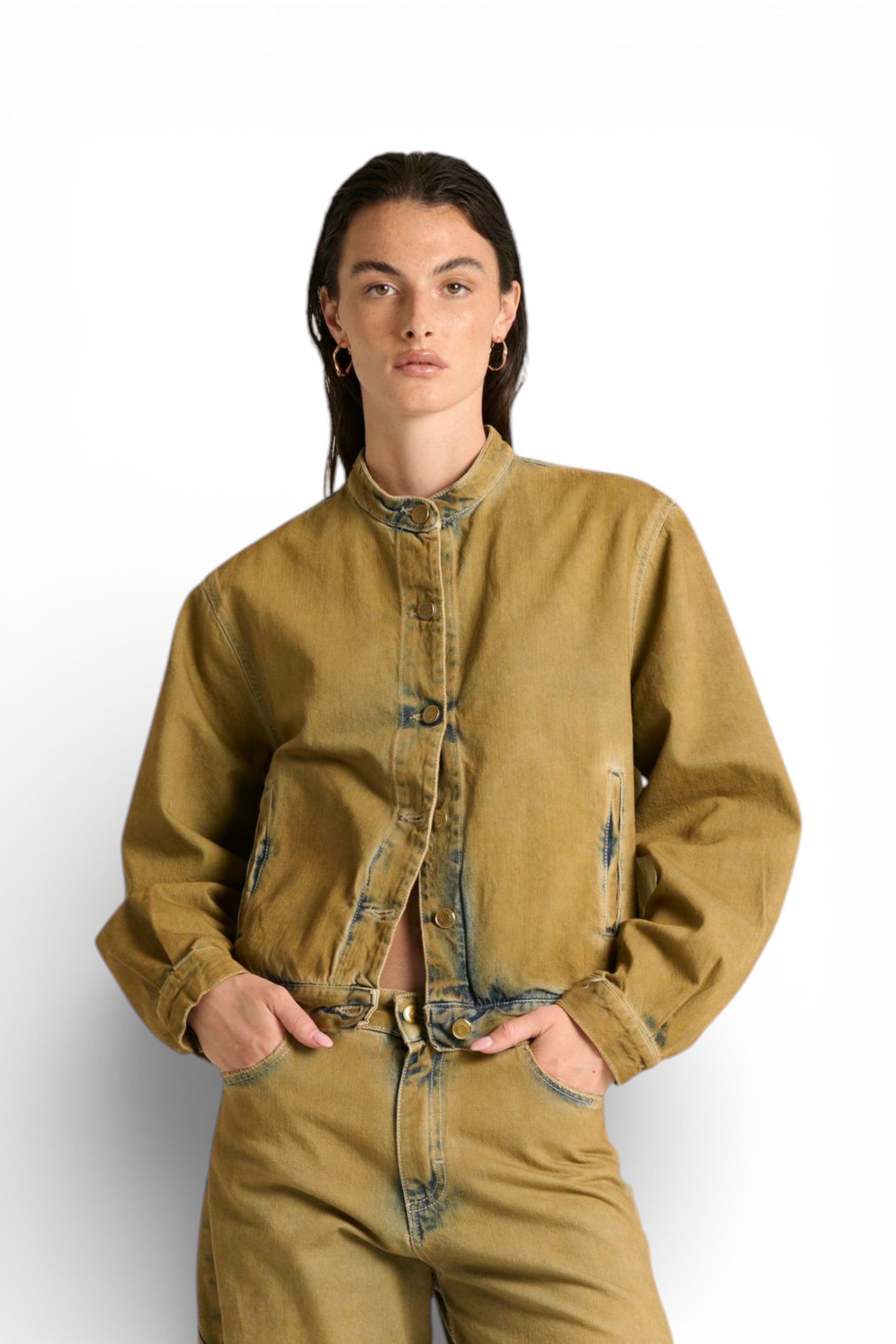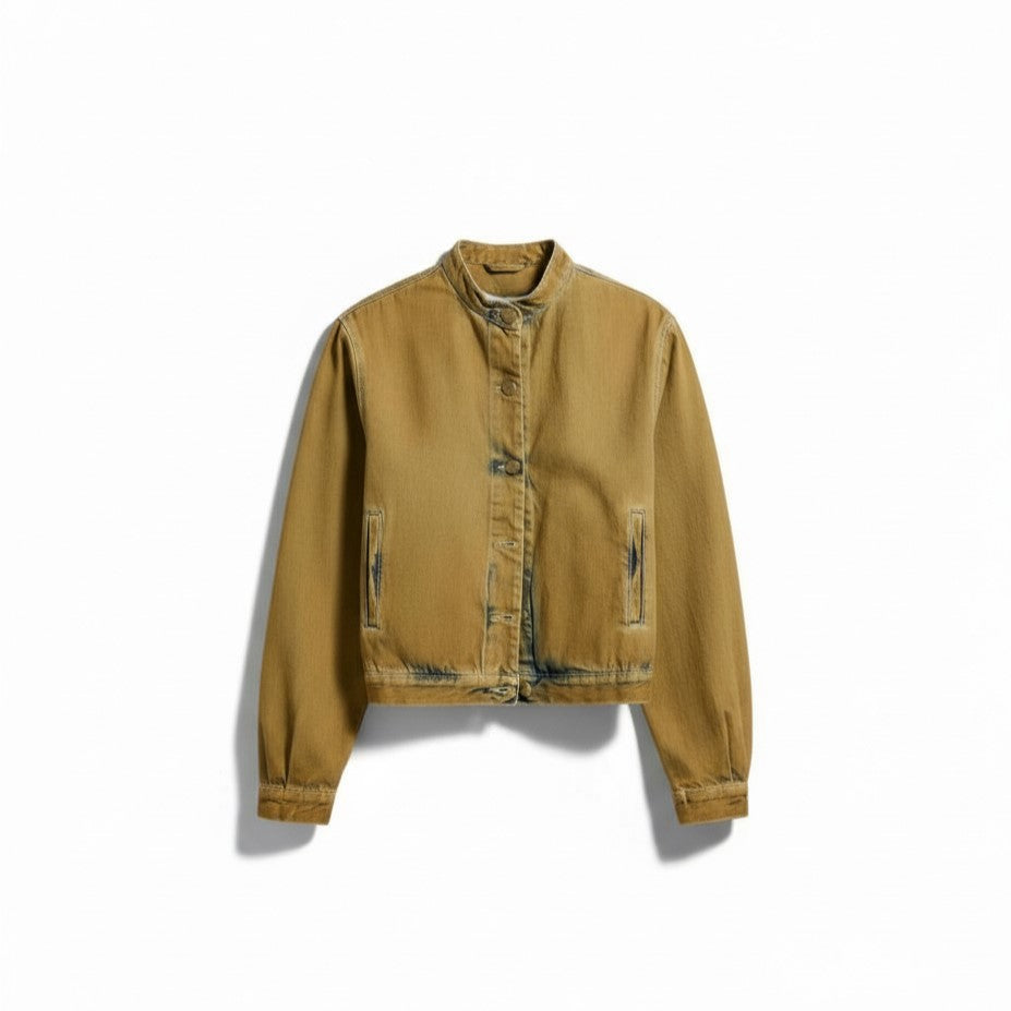Il giubbino Josie bomber con collo coreano in denim sovrattinto dirty è il capo che ridefinisce lo stile bomber con un trattamento unico e ricercato. Il denim blu fermo e sostenuto viene trasformato da una sovrattintura dirty che crea un effetto camel/tabacco, lasciando il blu originale visibile nelle battiture per un risultato contemporaneo e inedito. Il fit bomber regolare/comodo con collo coreano, tasche sul davanti e chiusura con bottoni unisce stile e praticità. Un giubbino che fa la differenza. ✨