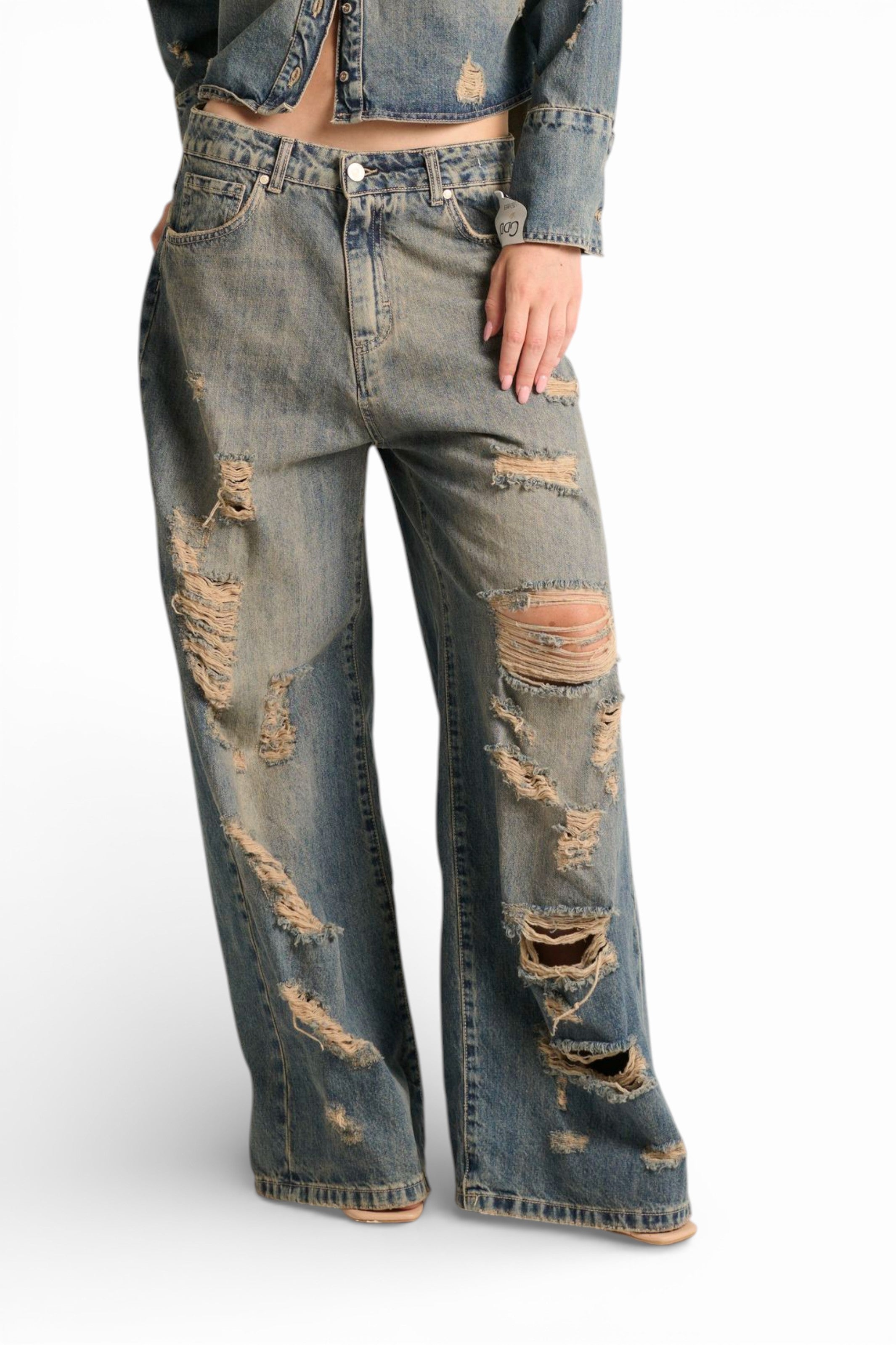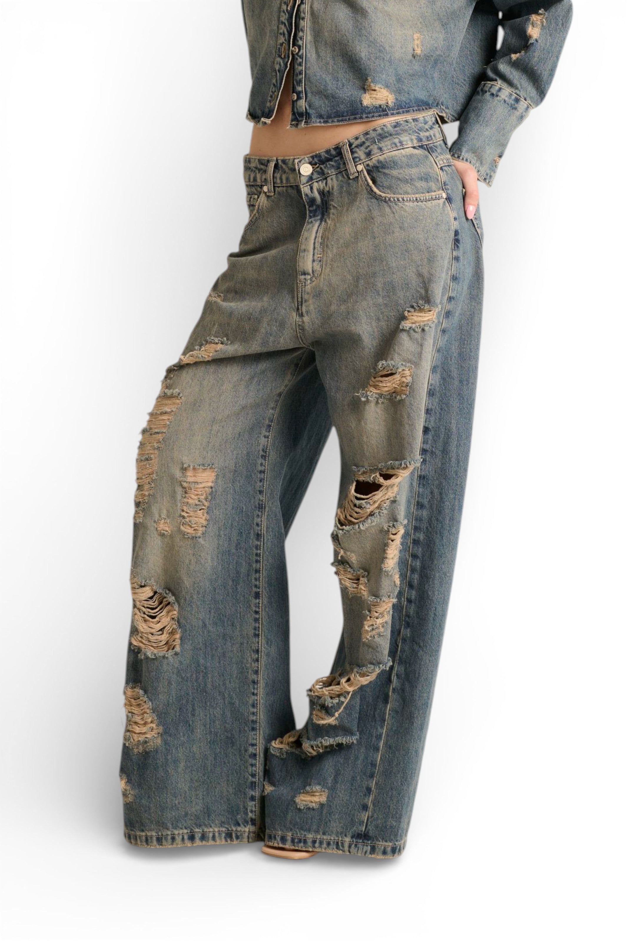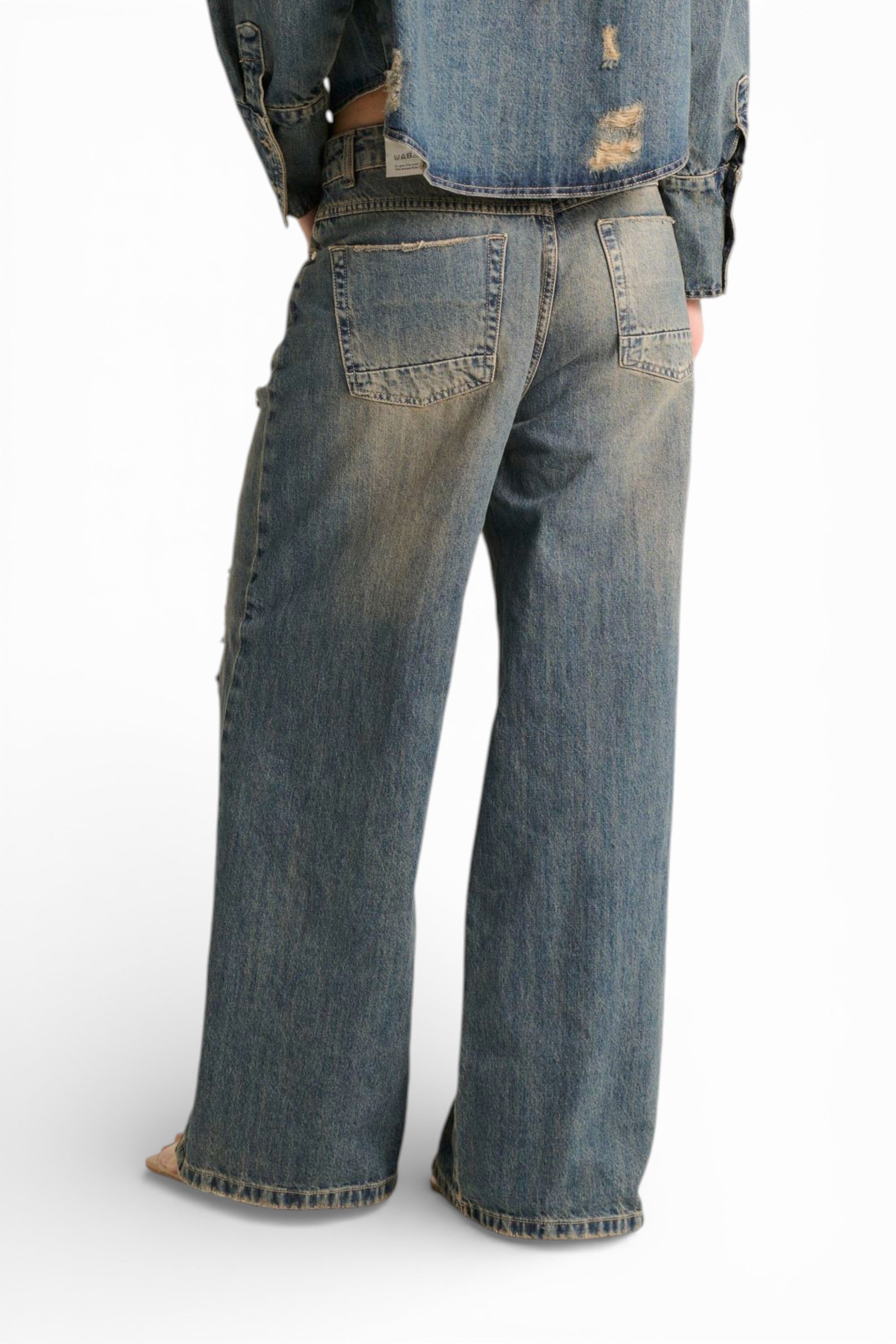 I jeans Ben oversize straight in denim fermo destroyed sono il capo che unisce volume contemporaneo e attitudine urban-grunge. Il denim fermo con lavaggio stone wash super used presenta una tonalità media di blu sporcata e rotta, con molature, abrasioni e sporcature al thè che creano un effetto vissuto autentico. Pensato per essere abbinato alla giacca camicia Jil dello stesso tessuto e lavaggio, per un total look denim destroyed dal forte impatto visivo. ✨